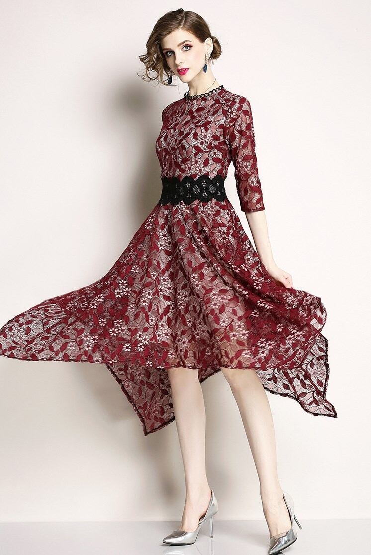ワンピース 膝丈 きれいめ aライン フレアスカート ウエストマーク 花柄レース 結婚式【即納 Mパープル】
